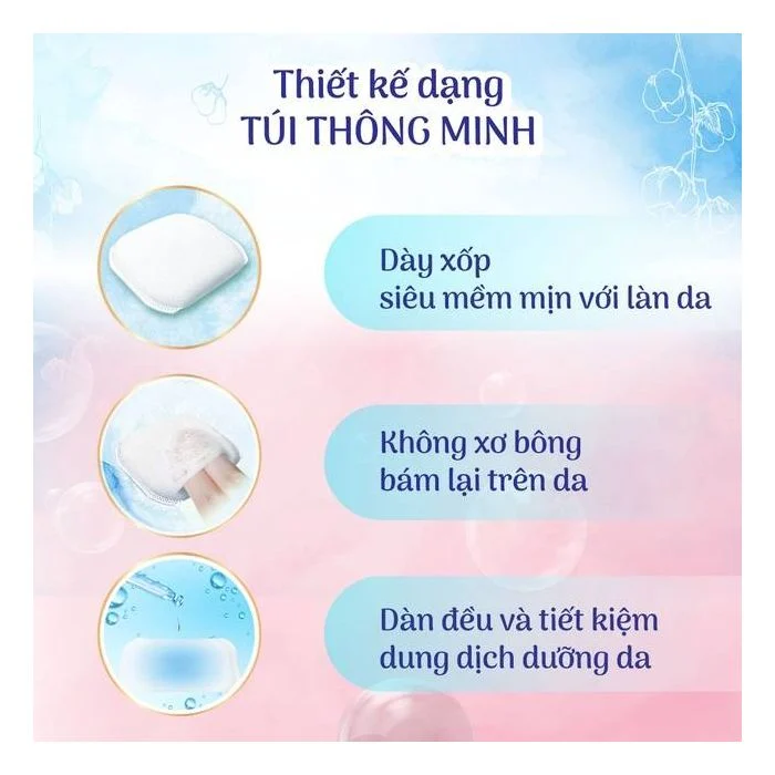 - Kết cấu sợi bông thấm dàn đều và tiết kiệm dung dịch dưỡng da, giúp chăm sóc da hiệu quả.