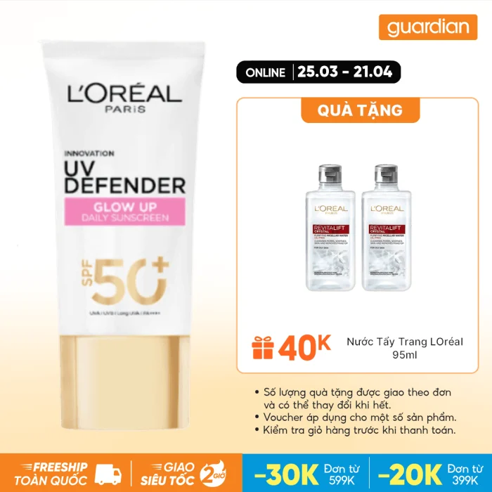 - Kem Chống Nắng X20 Thoáng Da Mỏng Nhẹ L’Oreal UV Defender Glow Up Daily Sunscreen SPF50+ PA++++ 50ml