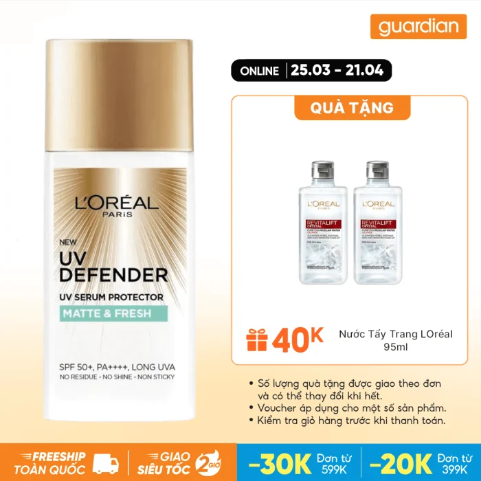 - Kem Chống Nắng Mịn Nhẹ Nâng Tông Giảm Thâm L’Oreal UV Defender Fresh Matte Daily Sunscreen SPF50+ PA++++ 50ml (Viền hồng) với Niacinamide